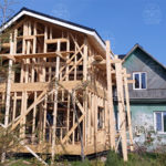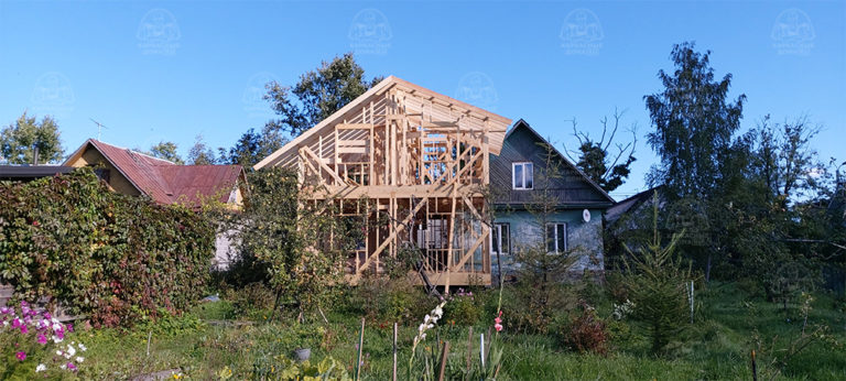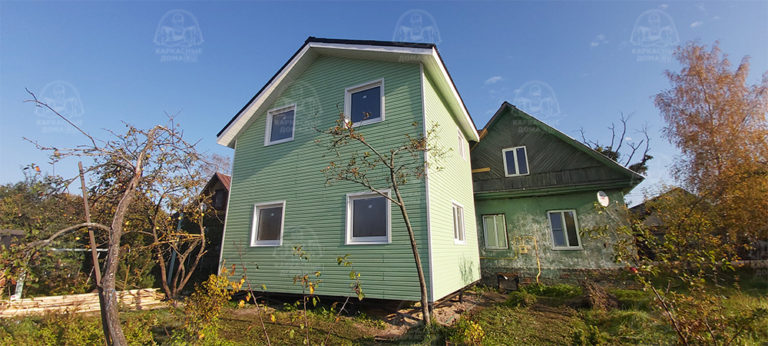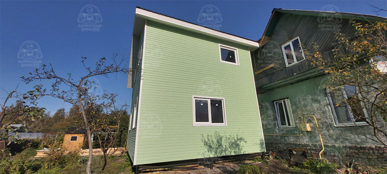 Сложность строительства состояла в том, чтобы новый каркасный дом со свайно-винтовым фундаментом, пристроить к уже существующему старому дому.
