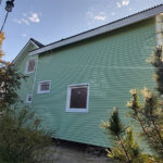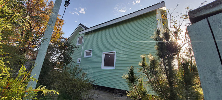 Наружная отделка - ветрозащитные плиты «Изоплат», толщиной 12 мм. Затем, через контробрешетку, смонтирован сайдинг «Docke Standart» Корабельный брус «D4D», Simple. Цвет: крем-киви.