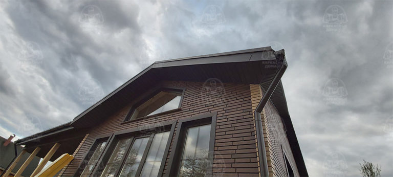 Карнизы (свесы) дома подшиты софитами Docke с центральной перфорацией, цвет коричневый.