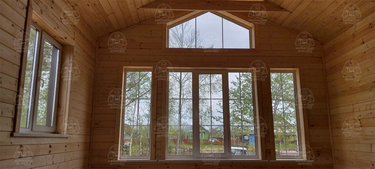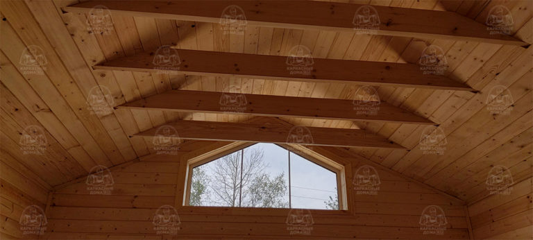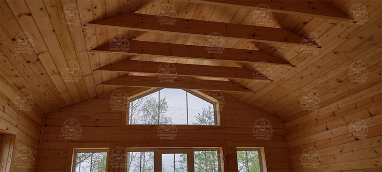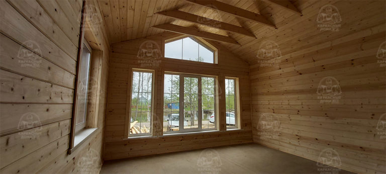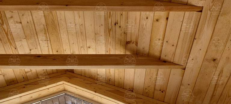 Внутренняя отделка. Стены и перегородки - имитация бруса, толщиной 16 мм, шириной 140 мм, камерной сушки. Потолок - Евровагонка хвойных пород, класс «А,В», камерной сушки.