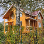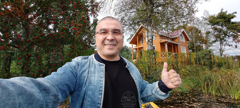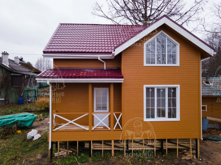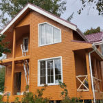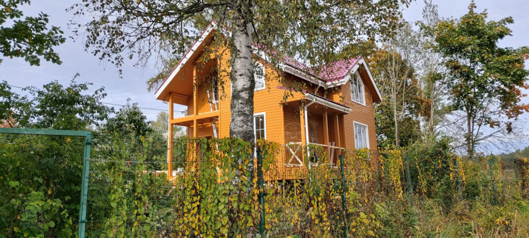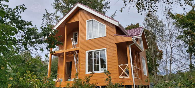 Каркасный полутораэтажный дом, для круглогодичного проживания, размером 8,0 х 8,0 м, со 128 м2. Имеет: 5 спален, 2 санузла, большую гостиную, 2 террасы, балкон, тамбур, 2 входа.