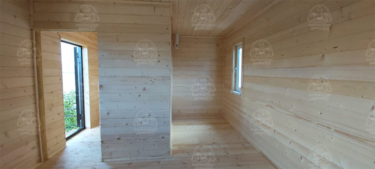 Наружная отделка- плиты OSB, толщиной 9 мм. Затем, через контробрешетку дом обшит виниловым сайдингом «Дёке». Серия «Стандарт» D4D, корабельный брус, цвет лимон.