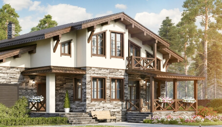 три спальни, большая гостиная, кухня, кабинет, просторный холл, тамбур, санузел, терраса, двухскатная крыша с кукушкой, прямоугольный эркер